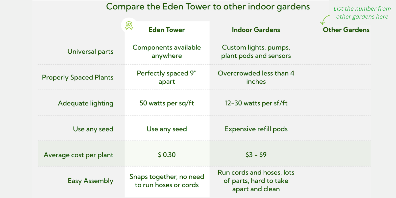 I purchased 2 Eden Towers through their kickstart program. I was so excited when they arrived. We had a few hiccups with shipping and a couple items were damaged but they quickly shipped out replacement parts and I was off to growing!! I just cleaned my tower and started about my 5th batch of plants. I have used it to start all my plants that I put outdoors in my garden and they are doing wonderful!!! During the winter I kept greens for salad - tastes SO much better than store bought! I have a tower from another company but this one surpasses it in quality, ease of growing, ease of cleaning (VERY easy to clean!!!!) and putting it together has been a breeze. PLUS it looks much better than the other round bulky one I have. This is sleek, fits nicely in a corner or along a wall...give it a try!! I think you will LOVE it!!