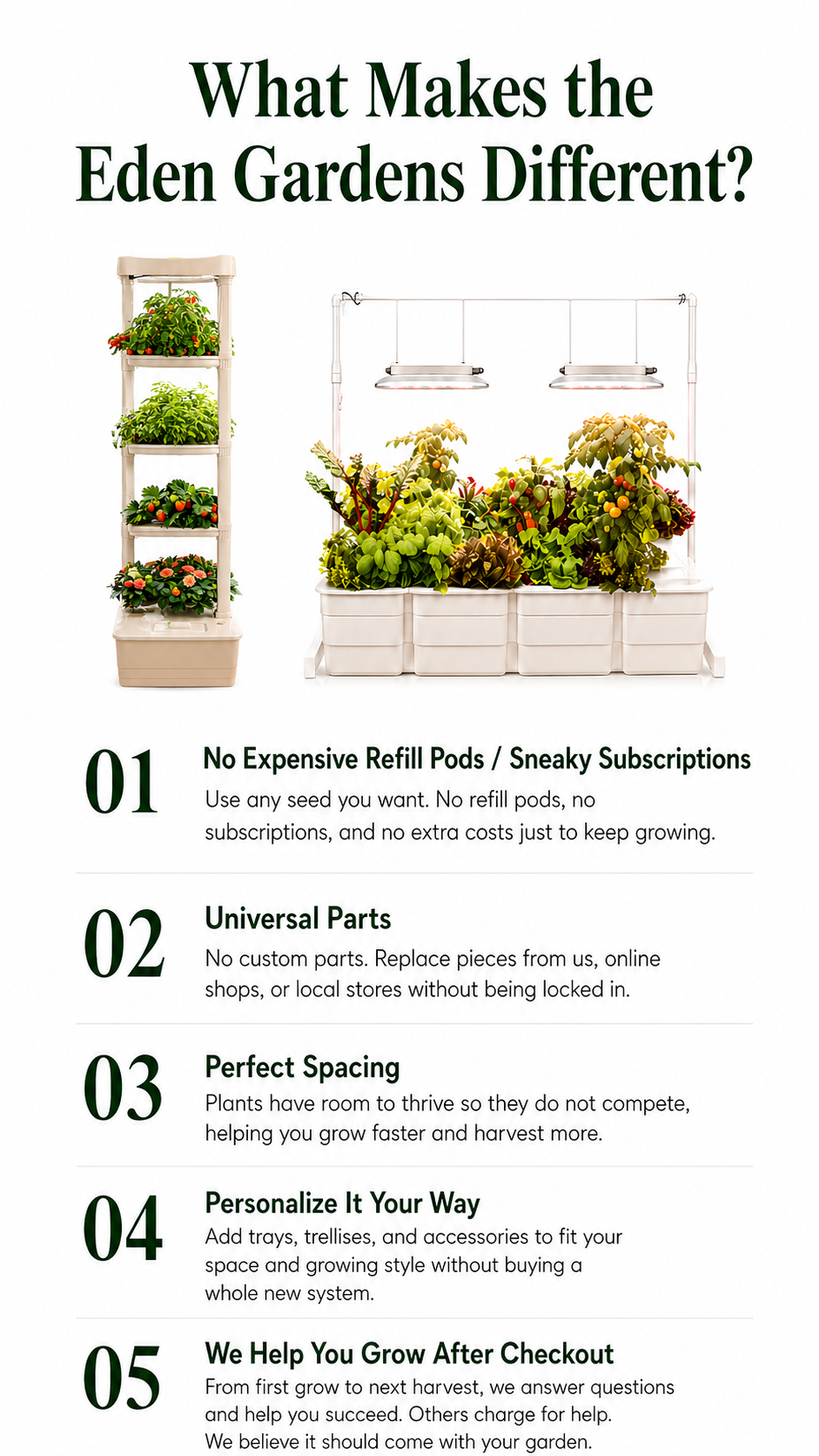 I have had my Eden Tower for 4 months now and I love it. I have 3 large pepper plants starting to bloom. It us easy and efficient. Just don't plant taller plants in upper sections as when the plants touch lights , it will burn them out!.