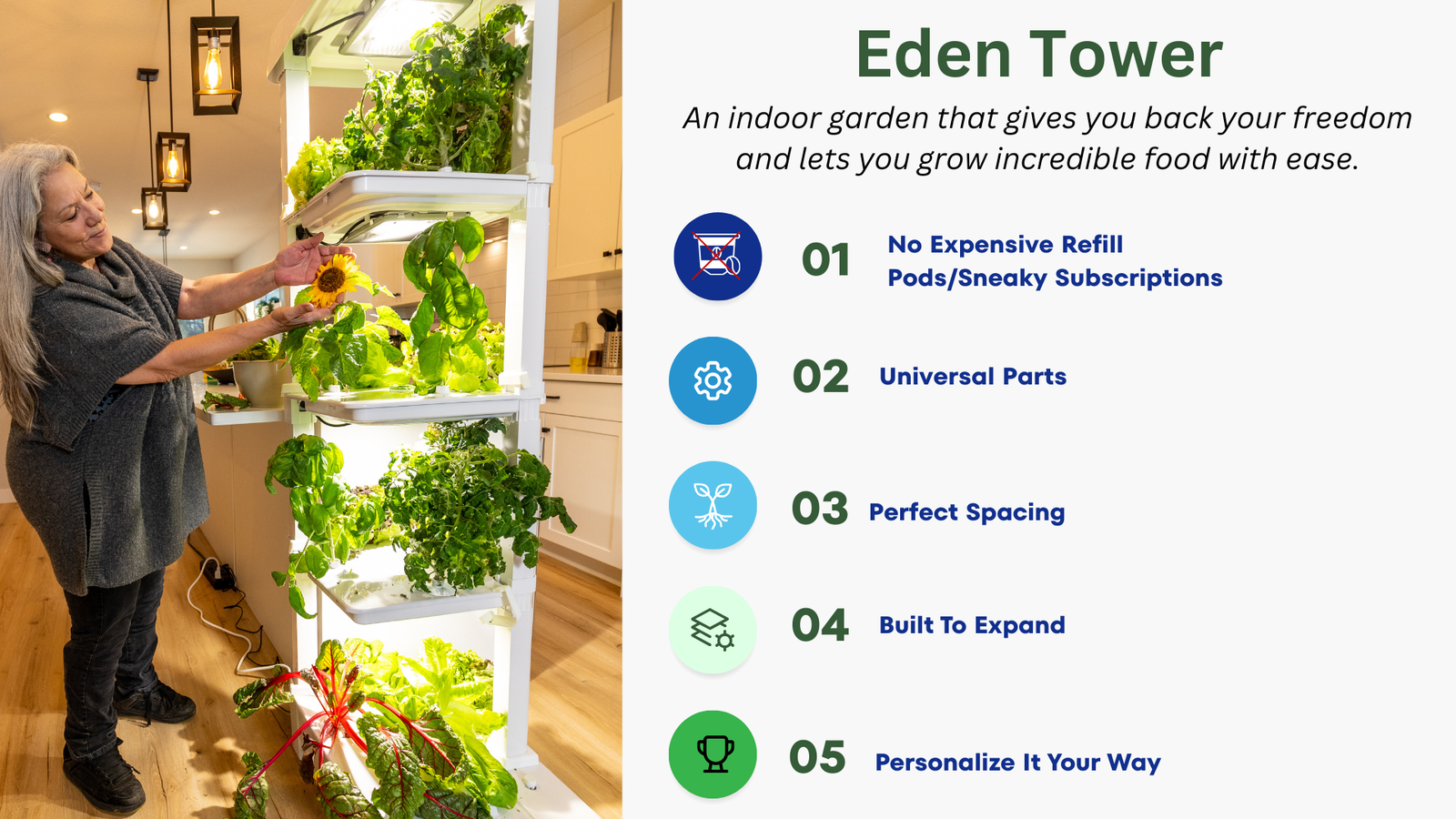 I purchased 2 Eden Towers through their kickstart program. I was so excited when they arrived. We had a few hiccups with shipping and a couple items were damaged but they quickly shipped out replacement parts and I was off to growing!! I just cleaned my tower and started about my 5th batch of plants. I have used it to start all my plants that I put outdoors in my garden and they are doing wonderful!!! During the winter I kept greens for salad - tastes SO much better than store bought! I have a tower from another company but this one surpasses it in quality, ease of growing, ease of cleaning (VERY easy to clean!!!!) and putting it together has been a breeze. PLUS it looks much better than the other round bulky one I have. This is sleek, fits nicely in a corner or along a wall...give it a try!! I think you will LOVE it!!