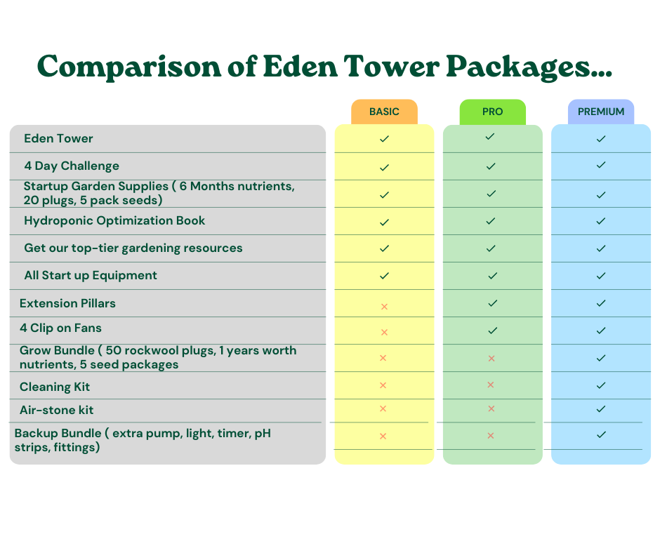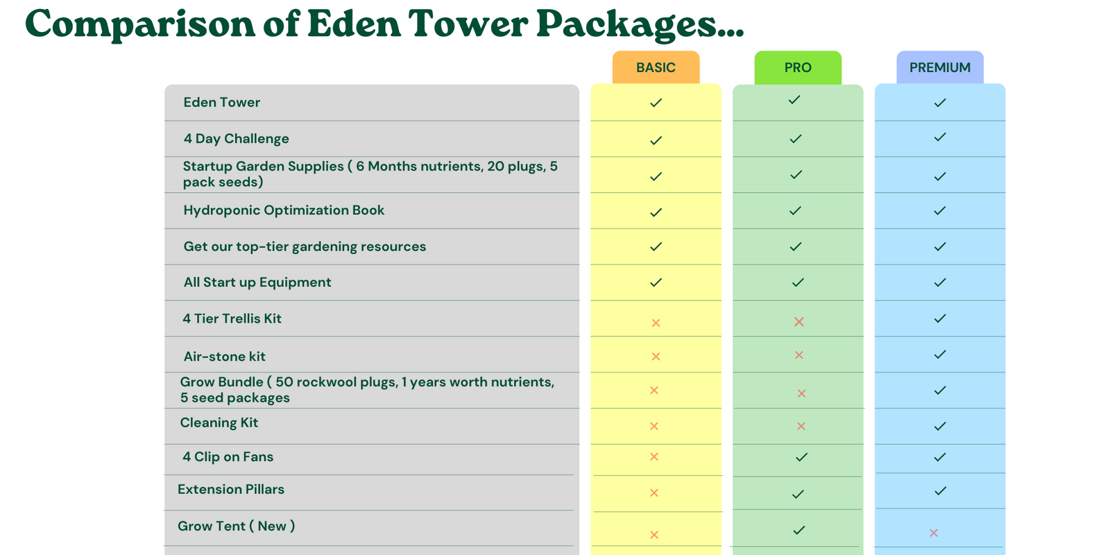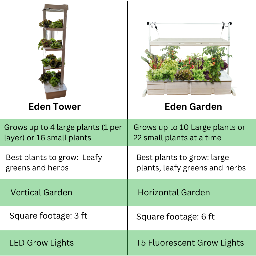 The main difference is the footprint. The Eden Garden grows both small and large plants amazing. You can grow more larger plants like tomatoes. While the Eden Tower has a much smaller footprint making it great for growing leafy greens and herbs. You can grow 1-4 large plants well.